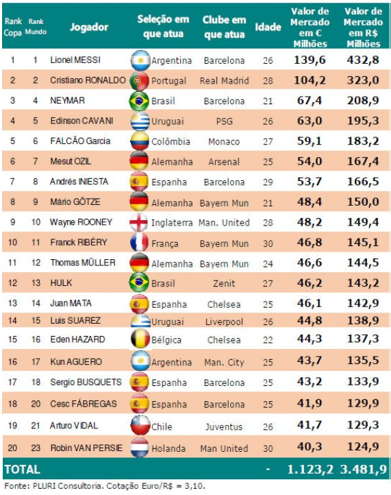 A falta de poco menos de mes y medio para la disputa del Mundial de Brasil, la consultora Pluri ha hecho pública la lista de los 20 futbolistas más valiosos del torneo mundial, una lista que es comandada por Leo Messi y Cristiano Ronaldo.